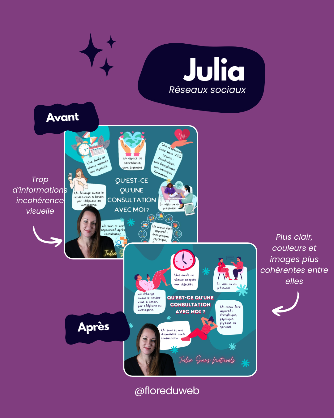 Je suis ravie des services offerts par Flore du web. Elle a tout de suite saisi mon univers et a réalisé un super visuel pour mes réseaux. Ses précieux conseils en tant que graphiste m'ont été très utiles pour revoir mon identité visuelle et ma charte graphique, ils vont assurément me servir pour mes futurs projets. Un grand merci.