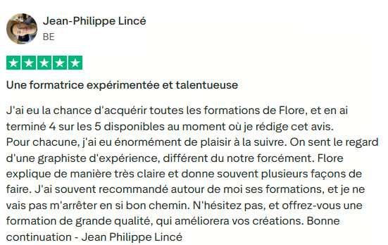 Pour chacune, j'ai eu énormément de plaisir à la suivre. On sent le regard d'une graphiste d'expérience, différent du notre forcément. Flore explique de manière très claire et donne souvent plusieurs façons de faire. J'ai souvent recommandé autour de moi ses formations, et je ne vais pas m'arrêter en si bon chemin. N'hésitez pas, et offrez-vous une formation de grande qualité, qui améliorera vos créations. Bonne continuation - Jean Philippe Lincé"