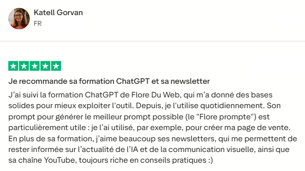 J’ai suivi la formation ChatGPT de Flore Du Web, qui m’a donné des bases solides pour mieux exploiter l'outil. Depuis, je l'utilise quotidiennement. Son prompt pour générer le meilleur prompt possible (le "Flore prompte") est particulièrement utile : je l’ai utilisé, par exemple, pour créer ma page de vente. En plus de sa formation, j’aime beaucoup ses newsletters, qui me permettent de rester informée sur l’actualité de l’IA et de la communication visuelle, ainsi que sa chaîne YouTube, toujours riche en conseils pratiques :)"