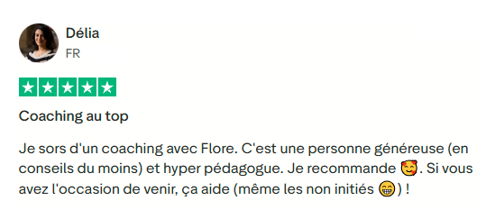 Je sors d'un coaching avec Flore. C'est une personne généreuse (en conseils du moins) et hyper pédagogue. Je recommande 🥰. Si vous avez l'occasion de venir, ça aide (même les non initiés 😁) !