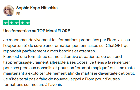 Je recommande vivement les formations proposées par Flore. J'ai eu l'opportunité de suivre une formation personnalisée sur ChatGPT qui répondait parfaitement à mes besoins et attentes.