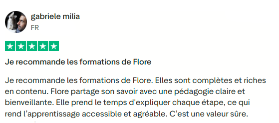 Je recommande les formations de Flore. Elles sont complètes et riches en contenu. Flore partage son savoir avec une pédagogie claire et bienveillante. Elle prend le temps d'expliquer chaque étape, ce qui rend l’apprentissage accessible et agréable. C’est une valeur sûre.