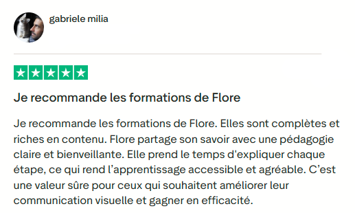 Je recommande les formations de Flore. Elles sont complètes et riches en contenu. Flore partage son savoir avec une pédagogie claire et bienveillante. Elle prend le temps d'expliquer chaque étape, ce qui rend l’apprentissage accessible et agréable. C’est une valeur sûre pour ceux qui souhaitent améliorer leur communication visuelle et gagner en efficacité.