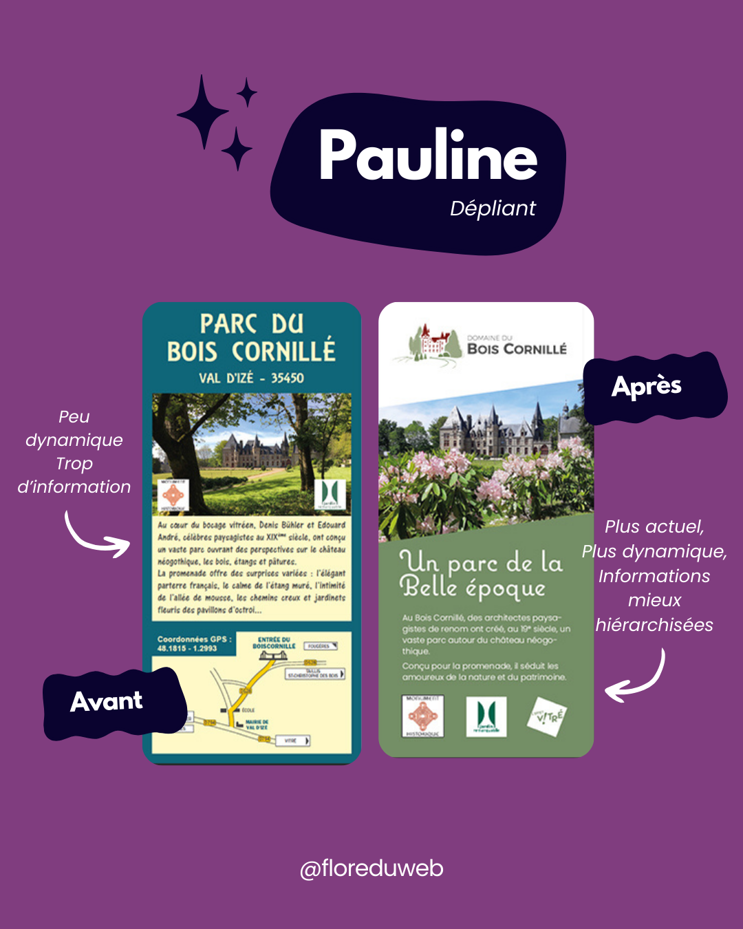 Après : grâce à la formation et à mon accompagnement, Pauline a pris le relais. Partie de zéro, elle gère aujourd’hui toute l’identité visuelle avec assurance. Ses visuels sont clairs, professionnels, et reflètent parfaitement l’image du domaine.
