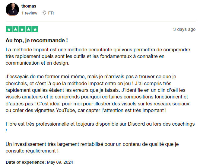 J'essayais de me former moi-même, mais je n'arrivais pas à trouver ce que je cherchais, et c'est là que la méthode Impact entre en jeu ! J'ai compris très rapidement quelles étaient les erreurs que je faisais. J'identifie en un clin d’œil les visuels amateurs et je comprends pourquoi certaines compositions fonctionnent et d'autres pas ! C'est idéal pour moi pour illustrer des visuels sur les réseaux sociaux ou créer des vignettes YouTube, car capter l'attention est très important !