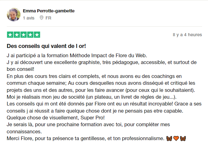 Les conseils qui m'ont été donnés par Flore ont eu un résultat incroyable ! Grâce à ses conseils, j'ai réussi à faire quelque chose dont je ne pensais pas être capable. Quelque chose de visuellement super pro !
